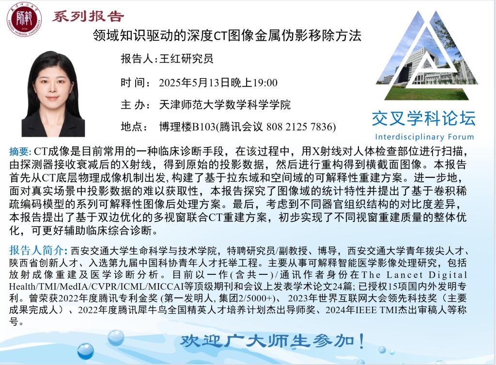 【预告】学术报告(2025-16)5月13日——领域知识驱动的深度CT图像金属伪影移除方法