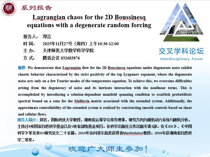 【预告】学术报告(2025-22)11月27日--Lagrangian chaos for the 2D Boussinesqequations with a degenerate random forcing